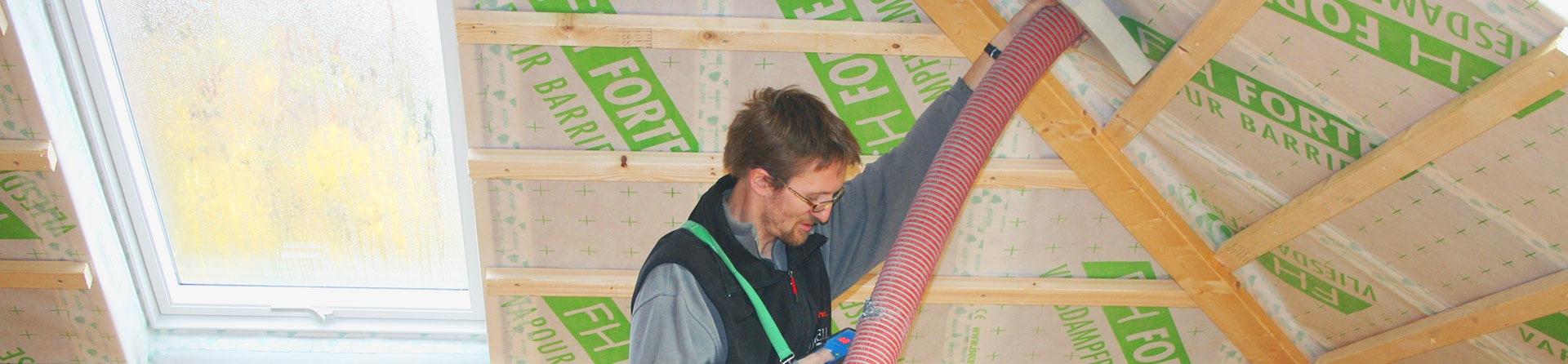 Bei der Dämmung des Daches von innen werden die Sparren an der Innenseite des Dachraumes auf die gewünschte Dämmstärke verstärkt bzw. aufgedoppelt. Hierfür verwenden wir i.d.R. die Sparrenexpander der Firma Hufer. Anschließend wird eine Dampfbremse überlappend verlegt und mit einer Haltelattung fixiert. Schließlich wird mittels Einblastechnik die Zellulosedämmung eingebracht.